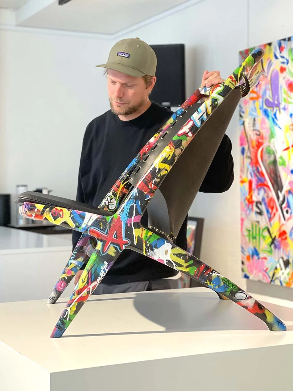 Martin Whatson med en av stolene som inngikk i hans samarbeid med den norske møbelprodusenten Eikund